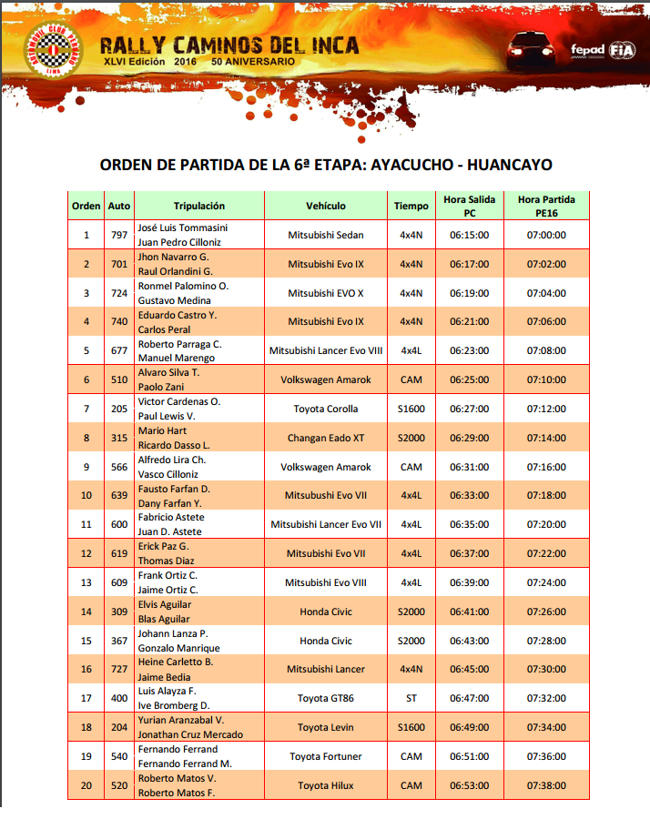 La sexta y penúltima etapa de Caminos del Inca comprenderá la largada desde Ayacucho hasta Huancayo, donde las tripulaciones buscarán alcanzar los mejores registros de tiempo, a fin de posicionarse entre los mejores de la clasificación general y categorías.