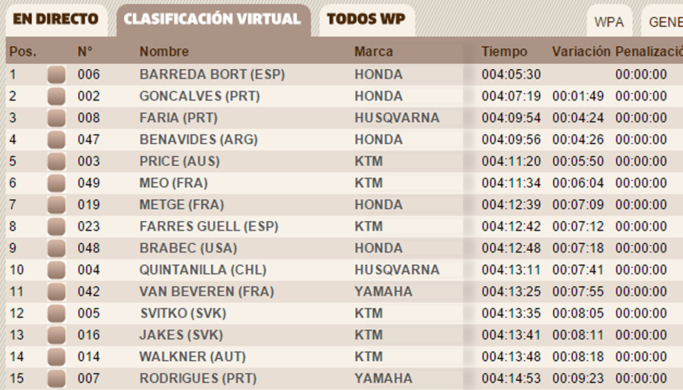 Con un total de 4h 05m 30seg, el español se mantuvo en la punta desde el WP2 manteniendo una ventaja promedio de 2 minutos del segundo lugar, Paulo Goncalves.