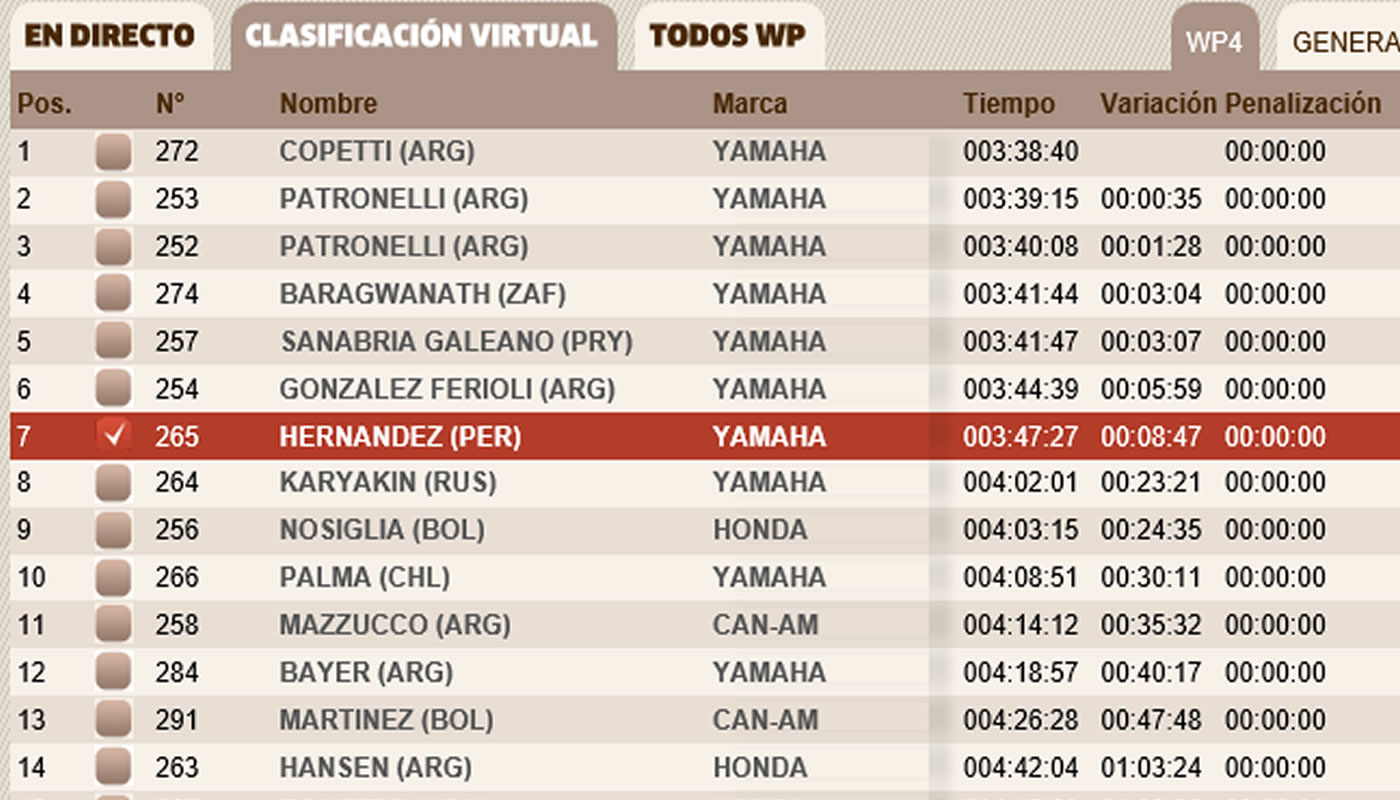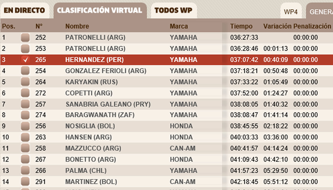 Sin embargo, En la tabla general, las posiciones no se han movido. Marcos Patronelli continúa puntero seguido de su hermano Alejandro quien hizo un tiempo de 1’13” más lento que su hermano. En ese sentido, el podio de la general es cerrado con el peruano Alexis Hernández, quien se encuentra a más de 30 min de la punta.