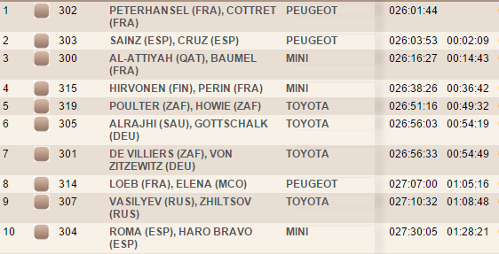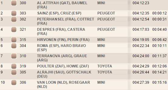 En la general Peterhansel suma 26.01.44 superando a su compañero de equipo Carlos Sainz que va segundo y Al-Attiyah en su mini logra el tercer lugar en la general.