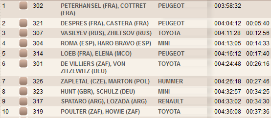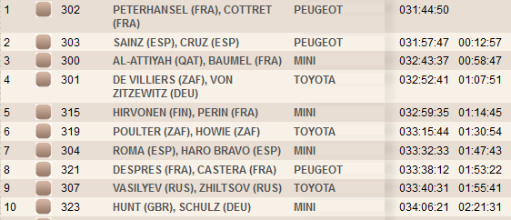 En la general, Peterhansel esta primero con 032.44.59, seguido del qatari Al-Attiyah y De Villiers a bordo de su Toyota.