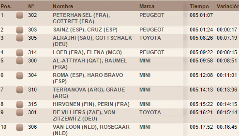 Peterhansel logra el primer una vez más luego de ganar la 4ta etapa, el francés no soltó la punta desde el séptimo WP hasta el final de la etapa dejando atrás al español Carlos Sainz que logra el segundo lugar a solo 17 segundos.