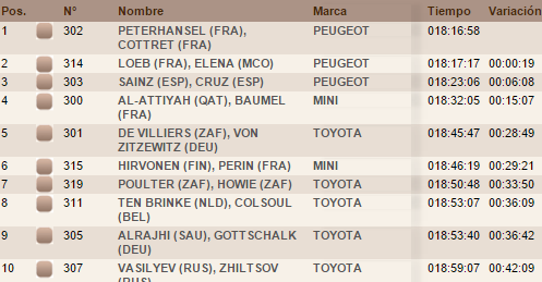 La dupla Peterhansel/Cottret terminaron con 005:01:07 y se convierten en líderes de la general a solo 19 segundos de Loeb comn 18.16.58.