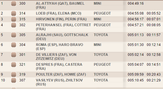 Con estos resultados, Peterhansel mantiene en la clasificación general la considerable diferencia de 51:55 minutos, mientras que el sudafricano Giniel De Villiers, con su Toyota, ocupa la tercera plaza. Mañana será el tiempo de la penúltima jornada con destino final en Villa Carlos Paz, con un especial de 481 sobre un total de 931 kilómetros de etapa.