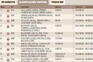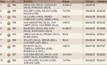 Nikolaev consigue la quinta etapa en camiones, el Kamaz se impone termino la etapa en 2.15.57 minutos dejando a Kolomy en segundo lugar con 2.16.46 a solo 46 segundos de ventaja. Mientras que el Iveco de Van Genugten logra el tercer lugar a 2.17.12.