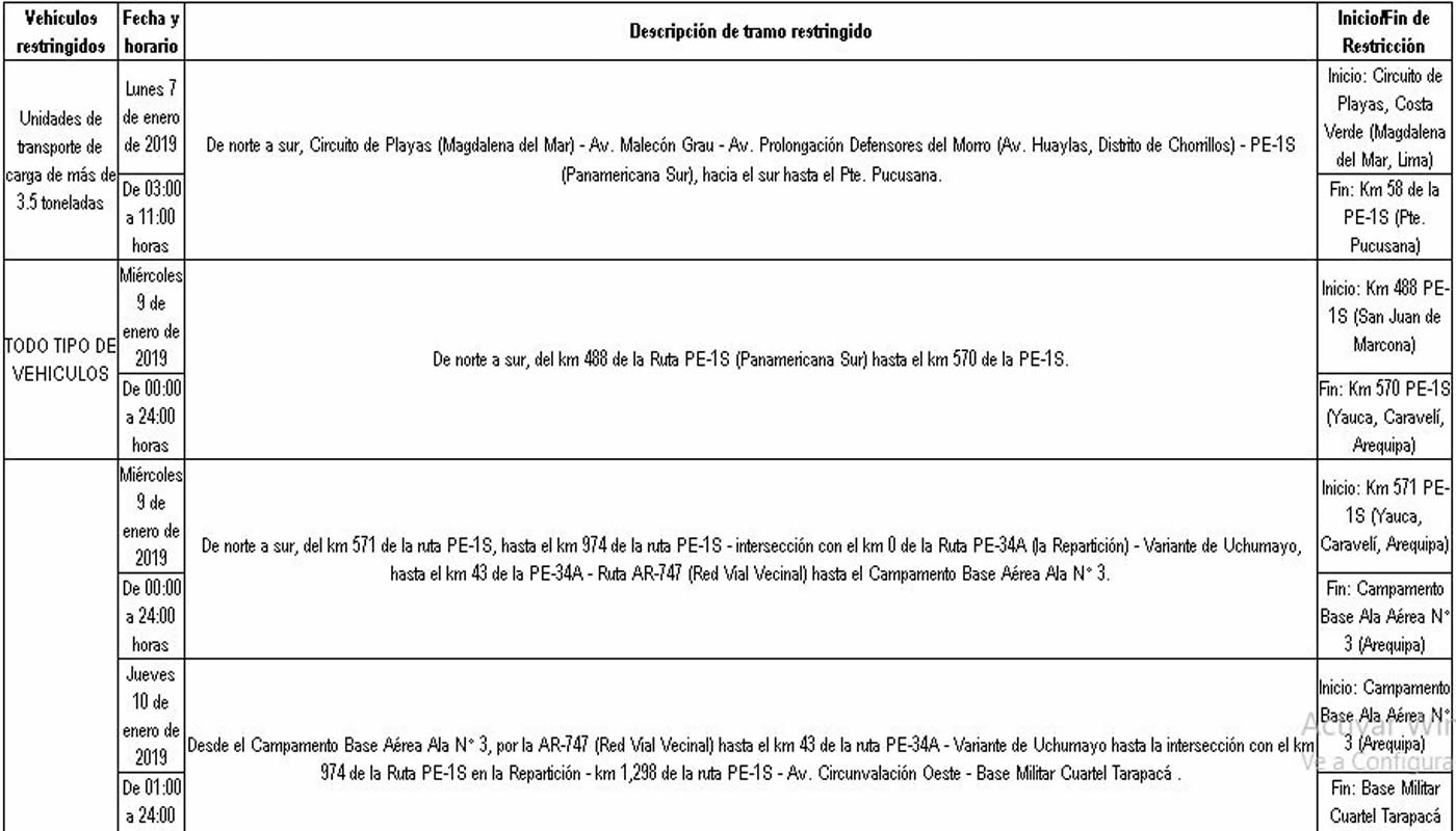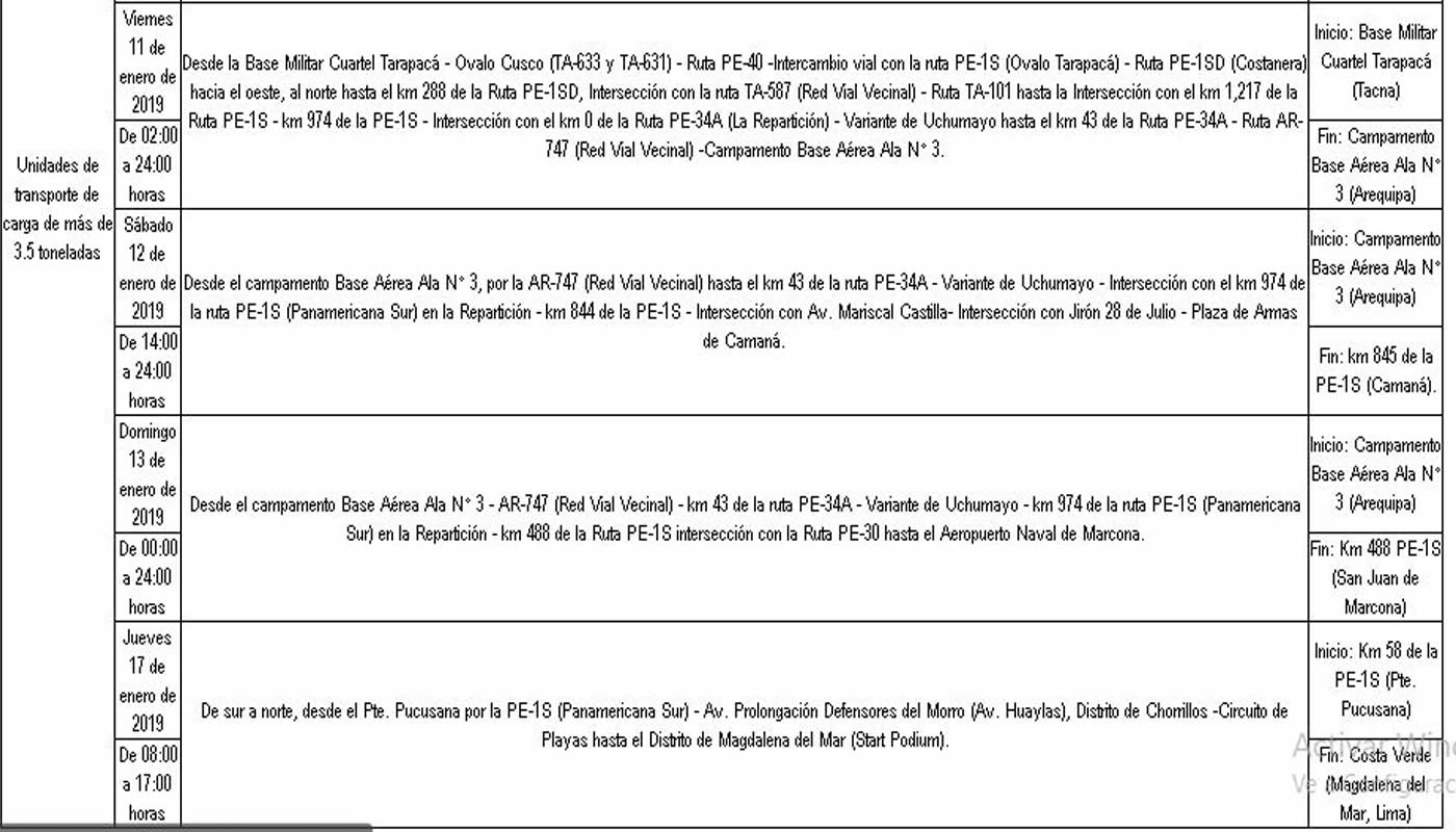 El Ministerio de Transportes, a través de una resolución emitida, dispuso medidas de restricción de tránsito en cuatro regiones, durante los días del Rally Dakar 2019.
