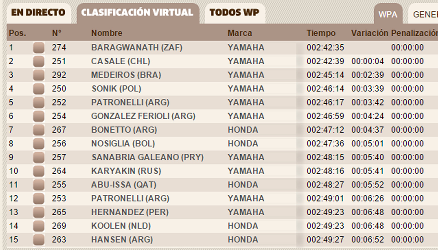 Cerrando el podio se posicionó el brasileño Marcelo Medeiros, quien se mantuvo constante a lo largo del recortado trayecto. Por su parte el polaco Rafal Sonik pudo escalar posiciones y culminar en cuarta posición.
