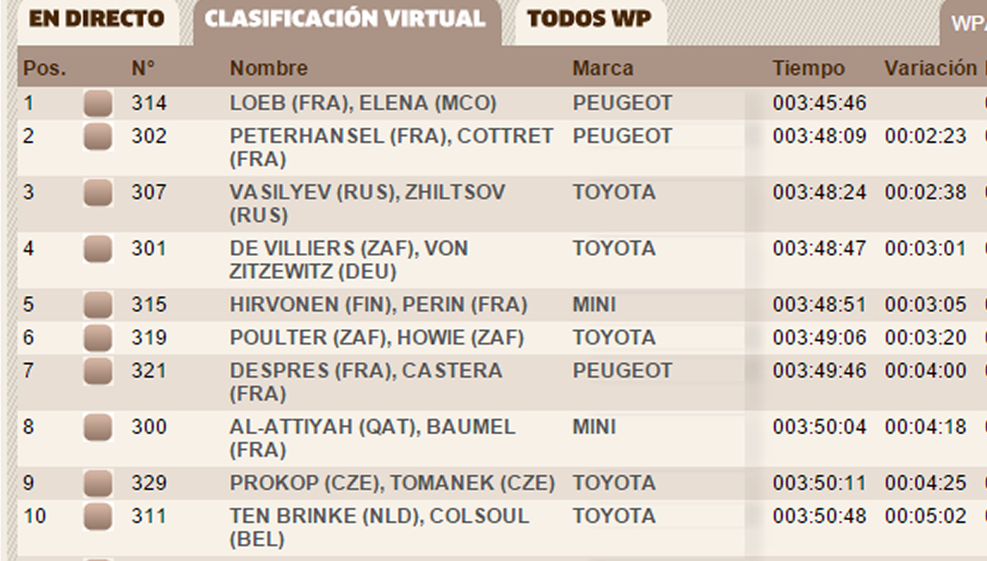 Las sorpresas de esta etapa, además de la victoria de Loeb, fueron la octava posición del favorito, el príncipe qatarí Al-Attiyah y el quinto lugar de Mikko Hiroven, quien también corre por primera vez el Rally Dakar.