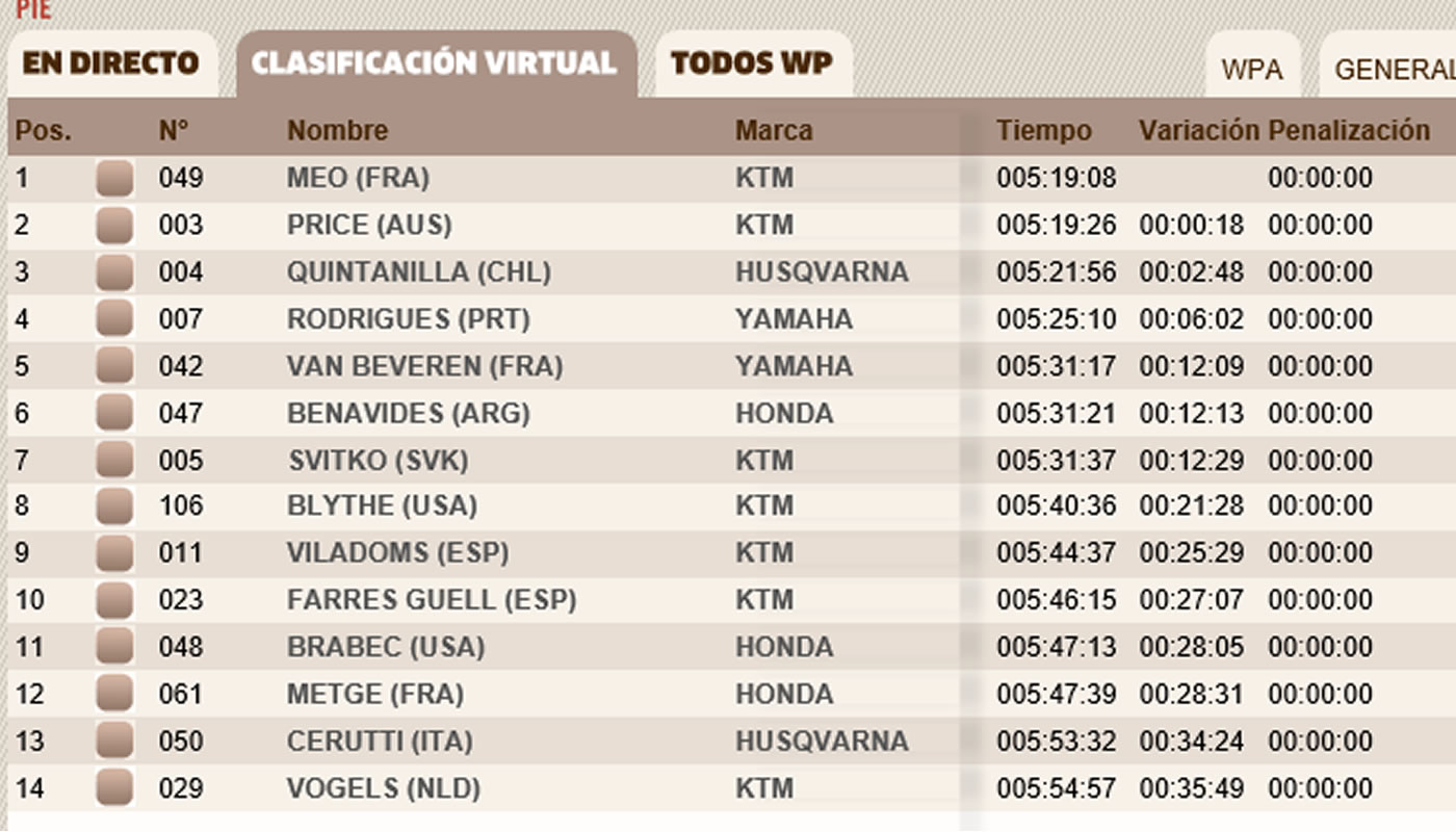 De esta manera, y pese a la suspensión que se confirmó por causas climáticas, el podio de undécima jornada del Dakar fue conformado por Méo, Price y Quintanilla en primer, segundo y tercer lugar respectivamente.