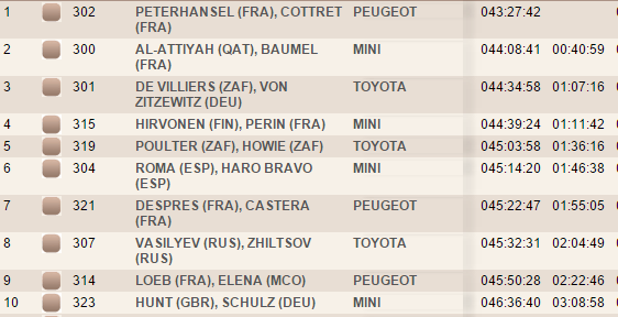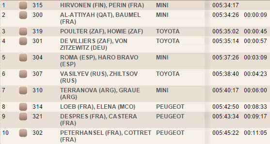 Hirvonen (Mini) se impuso sobre su compañero de equipo y actual campeón, el catarí Nasser Al-Attiyah. Tercero finalizó el sudafricano Leeroy Poulter (Toyota), en ese tramo sobre rutas sinuosas por sierras y montañas. Peterhansel, once veces campeón del Dakar, finalizó octavo regulando a su Peugeot ya que lidera los tiempos generales con unos 40 minutos sobre Al-Attiyah (Mini) y por más de una hora sobre el sudafricano Giniel de Villiers. (Toyota).