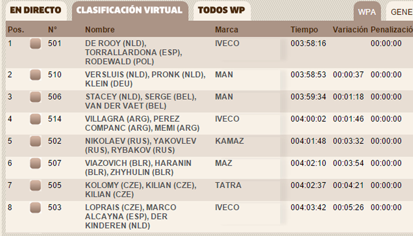 El podio de esta cuarta etapa del Dakar en la categoría Camiones es totalmente neerlandés, ya que Gerard De Rooy, Pieter Versluis y Hans Stacey se hicieron con el primer, segundo y tercer lugar respectivamente.