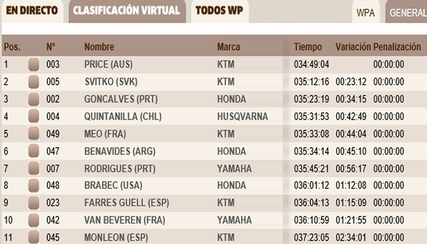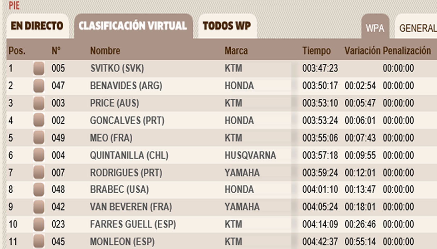 En la segunda posición se encuentra Benavides, quien estuvo por debajo de Sviko por 2’54”. De esta manera el argentino mejora su tiempo acumulado. No obstante, aún está separada por más de 40 minutos con el líder Toby Price.