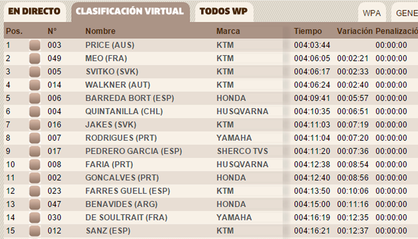 Al parecer, la altura boliviana no fue un impedimento para que Price se hiciera con la punta desde los primeros kilómetros de competencia, desplazando a los favoritos Joan Barreda, Ruben Faria y Paulo Goncalves a quienes aventajó por más de 5 minutos.