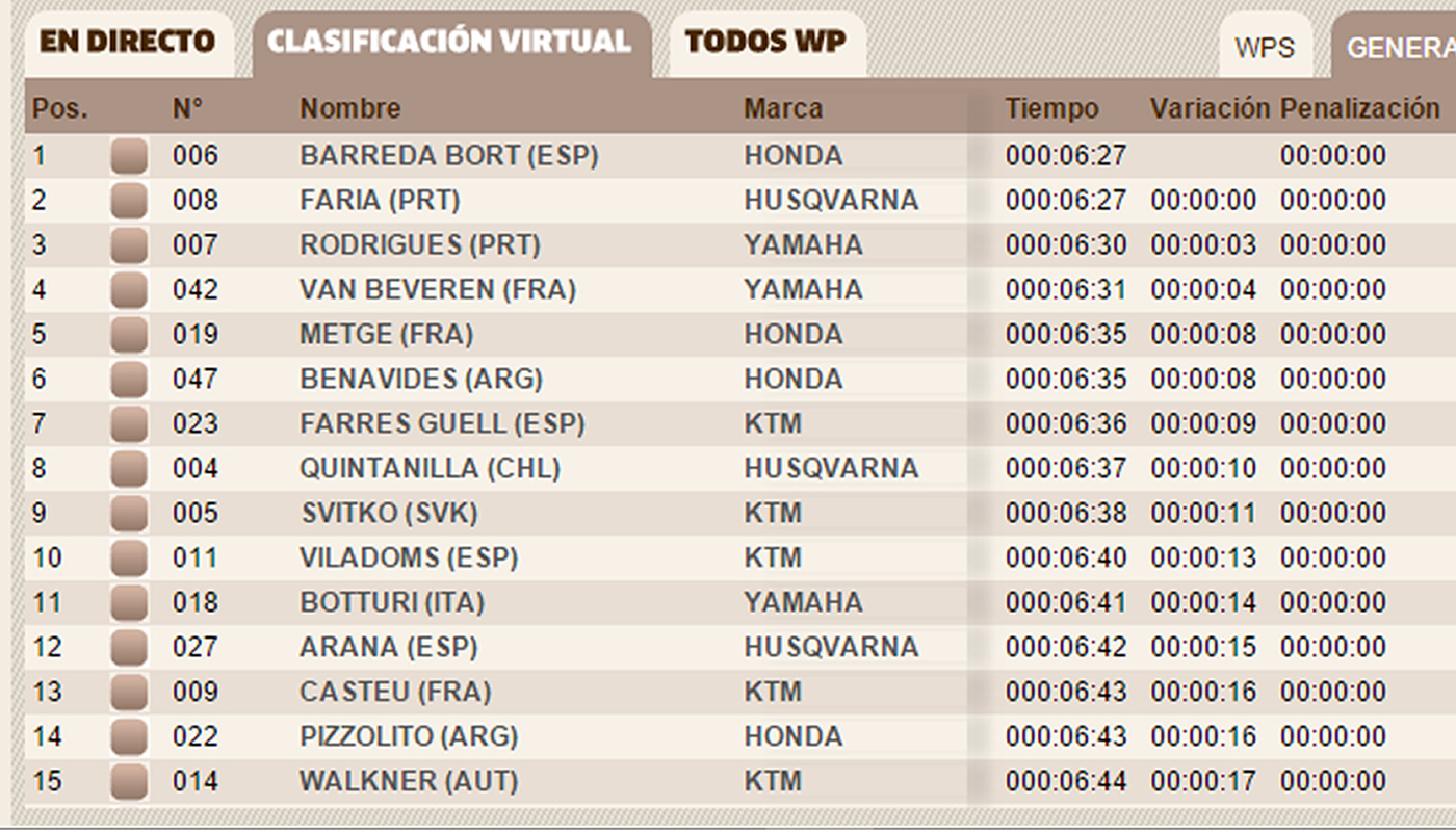 Por su parte, los portugueses Rubén Faria y Helder Rodrigues se hicieron con la segunda y tercera posición respectivamente. Faria (Husqvarna) logró un tiempo idéntico al de Barreda, mientras que Rodrigues (Yamaha) estuvo apenas tres segundos por debajo de ambos.