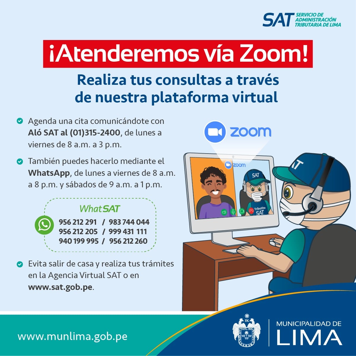 El SAT de Lima indicó en sus redes sociales que llevarán a cabo sus labores vía zoom desde las 8 de la mañana hasta las 3 de la tarde, por ende, podrás realizar tus consultas a través de la plataforma virtual.