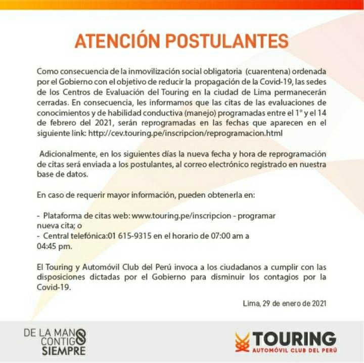 Por otro lado, el Touring manifestó que las sedes de los Centros de Evaluación permanecerán cerradas. Informan además que las citas de las evaluaciones de conocimientos y de habilidad conductiva, programadas entre el 1 y 14 de febrero serán reprogramadas.
