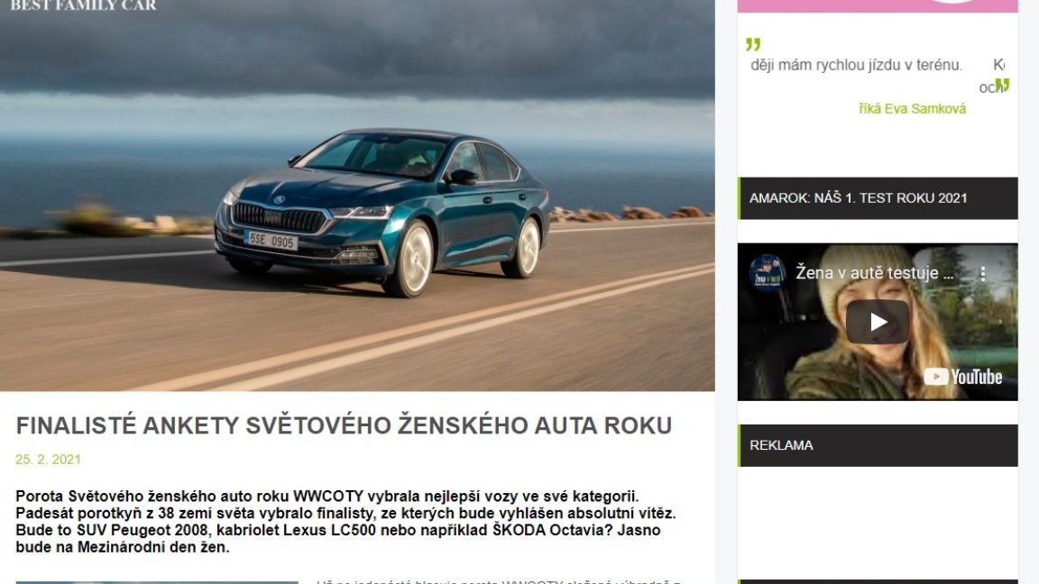 Además del sitio web www.womensworldcoty.com (sitio oficial del WWCOTY), podemos leer la nota en otros medios especializados. Tal es el caso del sitio web checo Zena V Aute www.zenavaute.cz, donde resaltan la elección del Skoda Octavia, coche de procedencia checa que ganó en la categoría Coche Familiar.