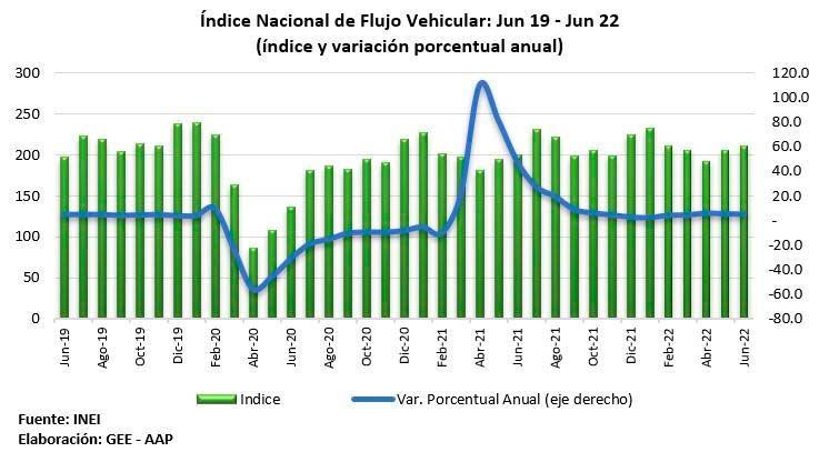 El Índice Nacional de Flujo Vehicular, que evalúa el tránsito de vehículos ligeros y pesados a través de los puntos de peajes de todo el país, registró un crecimiento de 5.1% al término de junio de 2022 en comparación con similar mes del año anterior, según información del Instituto Nacional de Estadística e Informática - INEI.