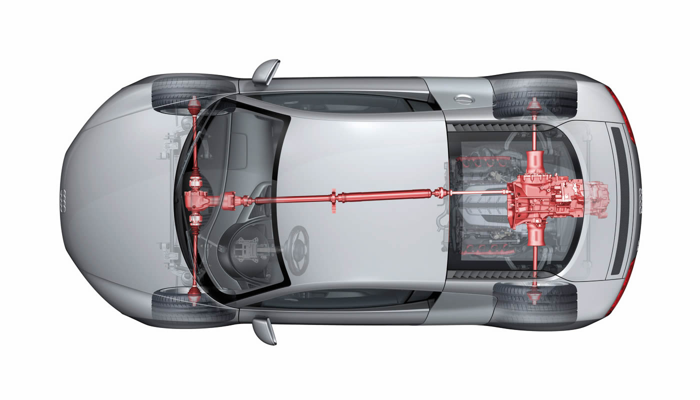 Las ruedas motrices son las traseras, y dispone de árbol de transmisión. Su disposición es algo más compleja, utilizándose en camiones y turismos de grandes potencias.