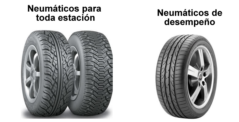 Las llantas para toda estación y las llantas de desempeño. Los expertos sugieren que las llantas de desempeño están diseñadas para un mayor manejo a alta velocidad. Mientras que las llantas para toda estación, están diseñadas para durar por un periodo de tiempo más largo.