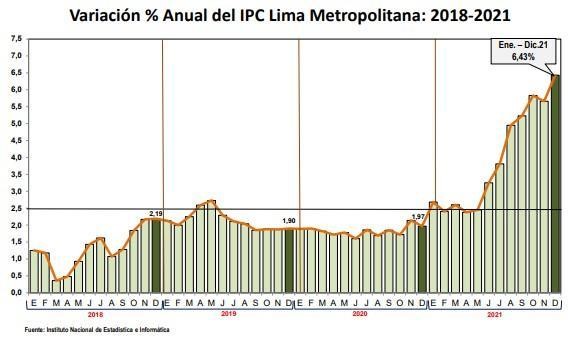 Alberto Morisaki, gerente de Estudios Económicos de la AAP, resaltó que el nivel de precios registró un incremento de 6.43% durante el 2021 frente al año anterior, muy por encima del 1.97% observado en el 2020, y también superando holgadamente el rango meta determinado por el Banco Central de entre 1% y 3%. Asimismo, “solo durante diciembre del 2021, el índice de precios reportó un aumento de 0.78% en comparación con noviembre del mismo año”, detalló.