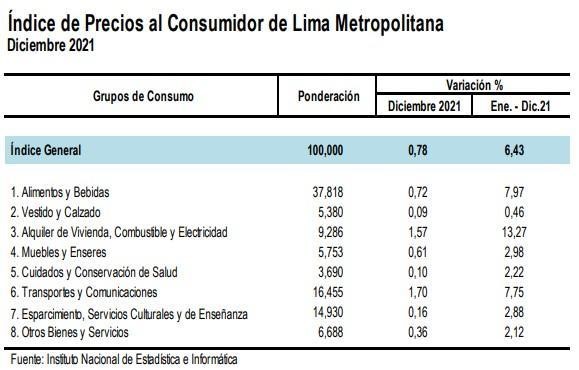 Por otro lado, el economista indicó que el resultado obtenido durante el 2021 estuvo influenciado principalmente por el incremento de los grupos de consumo compuesto por Alquiler de Vivienda, Combustible y Electricidad. En este caso en particular se observó una variación 13.27%. Sin embargo, no fue el único factor que impactó. Así, Alimentos y Bebidas se incrementó en 7.97%, Transportes y Comunicaciones en 7.75% y Muebles y Enseres en 2.98%, entre los principales.