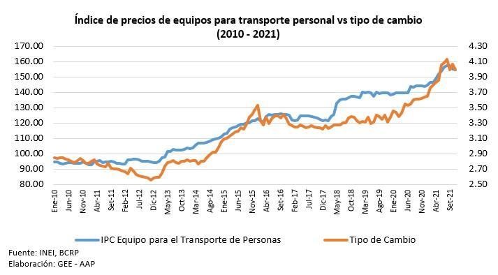 Asimismo, el nivel de correlación entre el tipo de cambio y los precios de los equipos para el transporte de personas es bastante alto, por lo que para el 2022 el comportamiento de los precios de los vehículos estará ligado a lo que suceda con la cotización de la moneda estadounidense, que a su vez es determinada por diversos factores como la estabilidad macroeconómica del país y a la predictibilidad de la política económica del Gobierno”, finalizó