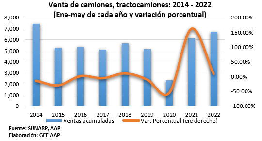 De otro lado, el Gerente de Estudios Económicos de la AAP resaltó el avance significativo que se ha observado en la venta de vehículos pesados, tanto a nivel mensual como en lo que va del 2022. Así, la venta de camiones y tractocamiones registró 1,573 unidades en el quinto mes del presente año, cifra superior en 32.4% a lo registrado en mayo de 2021. Por su parte, entre enero y mayo del 2022 se vendieron 6,723 unidades, incrementándose en 9.4% a tasa anual. “El desempeño positivo que registran los diversos sectores económicos es lo que impulsa estos resultados. Particularmente, aquellos que demandan de manera intensiva dichos vehículos, como la minería, además de la eliminación de las restricciones de tránsito en todo el país, que facilita la circulación y el normal desenvolvimiento de las actividades económicas”, dijo el economista tras precisar que otra razón también es la puesta en marcha de inversiones ya programadas en algunas actividades económicas. Sin embargo, anotó, dicho efecto se desvanecería en los siguientes meses en línea con las desfavorables expectativas para la inversión privada.