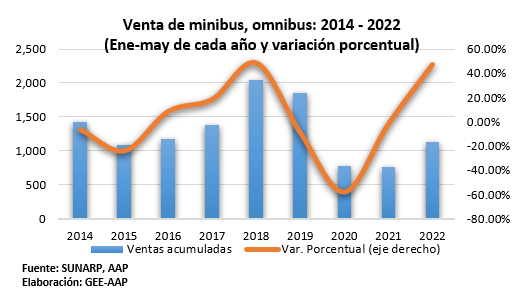 En cuanto a la venta de minibús y ómnibus, ésta llegó a 239 unidades al cierre de mayo del presente año, expandiéndose 92.7% frente a similar mes un año atrás. Igualmente, durante los primeros cinco meses del 2022, se vendieron 1,128 unidades, cifra superior en 46.9% a tasa anual. El destacable crecimiento en la comercialización de dichos vehículos fue influenciado por la baja base de comparación y por la recuperación que se observa en el sector transporte de personas, tanto a nivel urbano como interprovincial, ya que, ante el levantamiento de restricciones de circulación y aforo, han empezado a funcionar a mayor plenitud. Asimismo, “la recuperación de actividades como el turismo y entretenimiento, además del retorno a las actividades presenciales en centros educativos y laborales también han sido elementos importantes detrás de la recuperación de las actividades relacionadas al transporte de personas, así como de la venta de ómnibus y minibús”, puntualizó Morisaki.