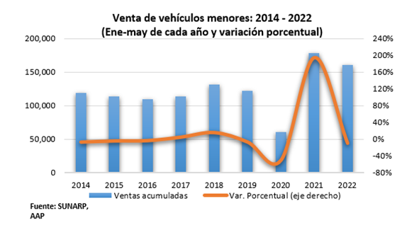 Por otra parte, se vendieron 31,972 vehículos menores (motos y trimotos) en mayo de 2022, anotando una variación negativa de 13.6% frente a igual mes del 2021, mientras que durante enero-mayo las ventas de dichos vehículos sumaron 160,219, cayendo en 9.9% en comparación con similar periodo del año pasado. Al desagregar la información se observa que la venta de motos retrocedió a 22,453 unidades en el quinto mes del 2022 (-13.9% interanual), en tanto que en lo que va del presente año las ventas se situaron en 111,904 unidades (-6.6% interanual). Finalmente, se vendieron 9,519 trimotos en mayo último y 48,315 unidades en los primeros cincos meses del 2022, cayendo en 12.9% y 16.9% a tasa anual; en cada caso. “La disminución en la venta se explican por la normalización de la demanda, tras dos años en donde las ventas de motos y trimotos reportaron tasas de crecimiento significativamente altas”, apuntó Alberto Morisaki tras explicar que con el levantamiento de un buen número de restricciones por el COVID-19, el uso del transporte público y la presencialidad a restaurantes, comercios y lugares afines se incrementó. Asimismo, la menor venta responde al aumento del nivel general de precios, que a su vez reduce la posibilidad de consumo de bienes por parte de las personas, entre ellos los duraderos como son los de este segmento del mercado.