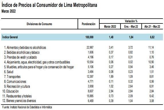 Luego de revisar información del Instituto Nacional de Estadísticas e Informática (INEI), el gremio automotor indicó que la variación mensual reportada en marzo del 2022 ha sido la más alta desde febrero de 1996, es decir hace 26 años, cuando llegó a 1.53%. Con este resultado, la inflación del primer trimestre se situó en 1.84%, mientras que la inflación anual avanzó a 6.82%.