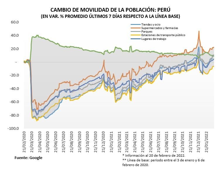 En línea con el aumento del flujo vehicular en el país, la movilidad de las personas también ha ido incrementándose sostenidamente durante gran parte del 2021, particularmente luego de ocurrida la segunda ola del brote vírico. En ese sentido, agregó que, en promedio la movilidad de los peruanos -calculado por la plataforma Google- viene aumentando en todos sus segmentos, y en la mayoría de ellos, con excepción de la movilidad hacia las estaciones de transporte público, se encuentran por encima de sus niveles prepandemia. “Esta tendencia se ha mantenido para inicios del presente año, por lo que se espera que siga mejorando en las siguientes semanas, siempre y cuando se contenga cualquier brote de contagios que pueda presentarse en el futuro”, añadió Morisaki.