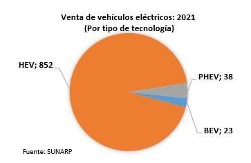 Al revisar la información de manera desagregada, según tipo de tecnología, se observa que los vehículos eco-amigables más vendidos entre enero y setiembre de 2021 fueron los híbridos convencionales o HEV (Hybrid Electric Vehicle, por sus siglas en inglés) con 852 unidades, seguido de los híbridos enchufables o PHEV (Plug-in Hybrid Electric Vehicle) con 38 unidades y más atrás se encuentran los eléctricos puros o BEV (Battery Electric Vehicle) con 23 unidades.
