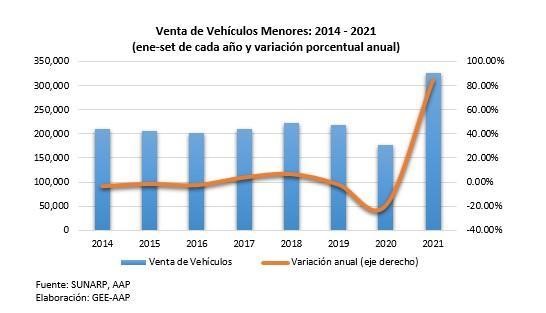 En cuanto a los vehículos menores (motos y trimotos), las cifras registradas ponen en evidencia nuevamente resultados positivos con 37,773 unidades vendidas en setiembre, mientras que entre enero y setiembre de este año, las ventas totales alcanzaron las 326,093 unidades, superando en 84.8% lo registrado en igual lapso del 2020 y en 48.9% respecto al 2019.