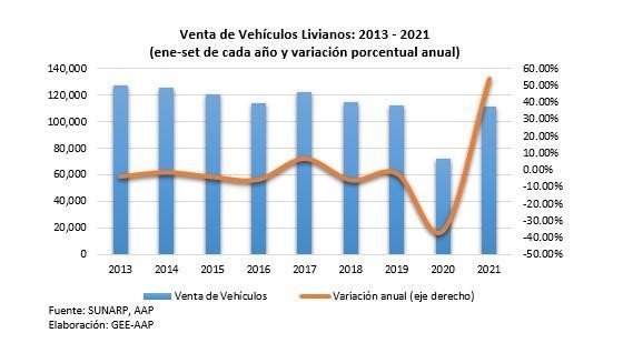 Según informó la Asociación Automotriz del Perú (AAP), la venta de vehículos livianos nuevos (camionetas, pick up y furgonetas, station wagons, SUV y todoterrenos) sumó 15,186 unidades en el noveno mes del 2021, mientras que durante el periodo enero-septiembre las ventas totalizaron 111,654 unidades, cifra superior en 54.1% respecto a similar lapso del 2020, aunque ligeramente menor (en 0.9%) frente a igual periodo del 2019, de acuerdo a información de la Superintendencia Nacional de Registros Públicos (SUNARP).