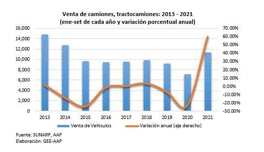 En cuanto a los vehículos pesados, la venta de camiones y tractocamiones sumó 1,393 unidades en setiembre último, por lo que durante los primeros 9 meses del 2021 se reportaron 11,307 unidades vendidas. Dicho resultado fue mayor en 59.9% y 23% respecto a periodos similares del 2020 y 2019, respectivamente. “Este avance fue influenciado por el repunte registrado en sectores como la construcción, minería, comercio, entre otros”, refirió Morisaki al tiempo de señalar que responde al uso intensivo de vehículos de transporte pesado que se viene observando en el país.