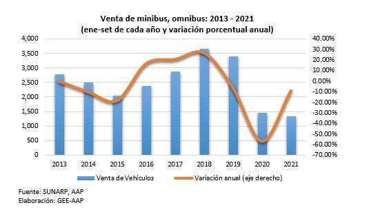De otro lado, la venta de ómnibus y minibús se ubicaron en 197 unidades en el noveno mes del presente año, y llevaron a que en total se comercialicen 1,325 unidades entre enero y setiembre del 2021, -9.0% y -61.1% en comparación con el 2020 y 2019, en cada caso. “Es importante señalar que el transporte de personas, tanto a nivel urbano como provincial ha sido uno de los sectores más afectados por la pandemia debido a las restricciones de aforo emitidas por el Gobierno, elemento que ha contenido su recuperación a diferencia del resto de actividades económicas”, comentó el especialista.