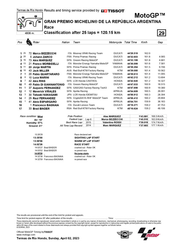 Algunos dicen que esta carrera es la más dramática de la temporada. Y hubo de todo un poco. Lluvia, sorpresas y drama. Bezzecchi es ahora el líder de la competencia con un merecido primer lugar, mientras que Bagnaia sufrió una aparatosa caída que lo relegó hasta el puesto 16 en el GP de Argentina. Alex Márquez avanzó, pero todavía le cuesta creérselo.
