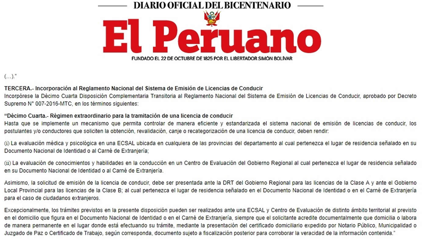 De esta manera, los que vivan en Lima deberán tramitar su licencia en esta ciudad, mientras que los que residen en provincia lo harán en sus regiones respectivas. Así lo dispone el Decreto Supremo N° 011-2018-MTC, el cual se publicó en El Peruano, el pasado 11 de julio.